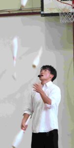 三組目は何度もテレビ出演している大道芸『エクストリーム芹川』さんです。軽快なトークと共に繰り広げられるジャグリングは圧巻です!技が決まった時は、皆で「エクストリーーム!!」と掛け声をして、会場に大きな一体感が生まれます📣